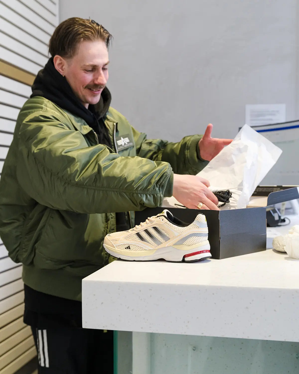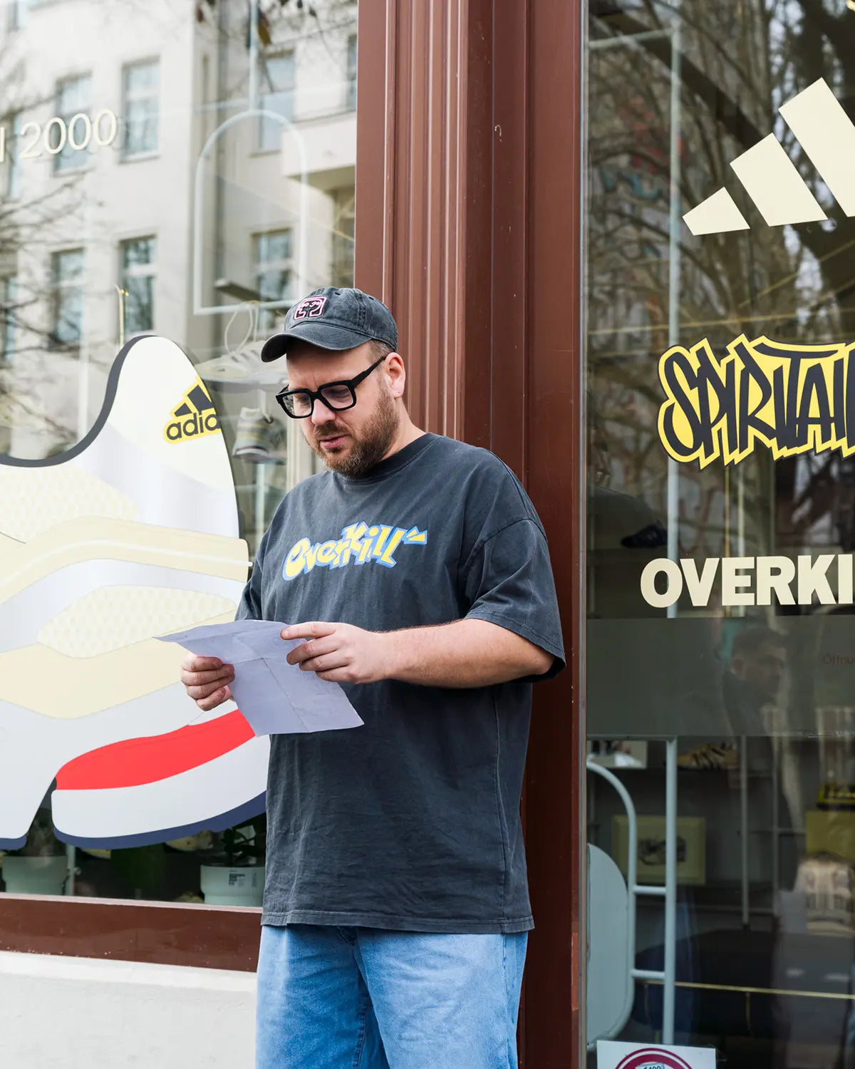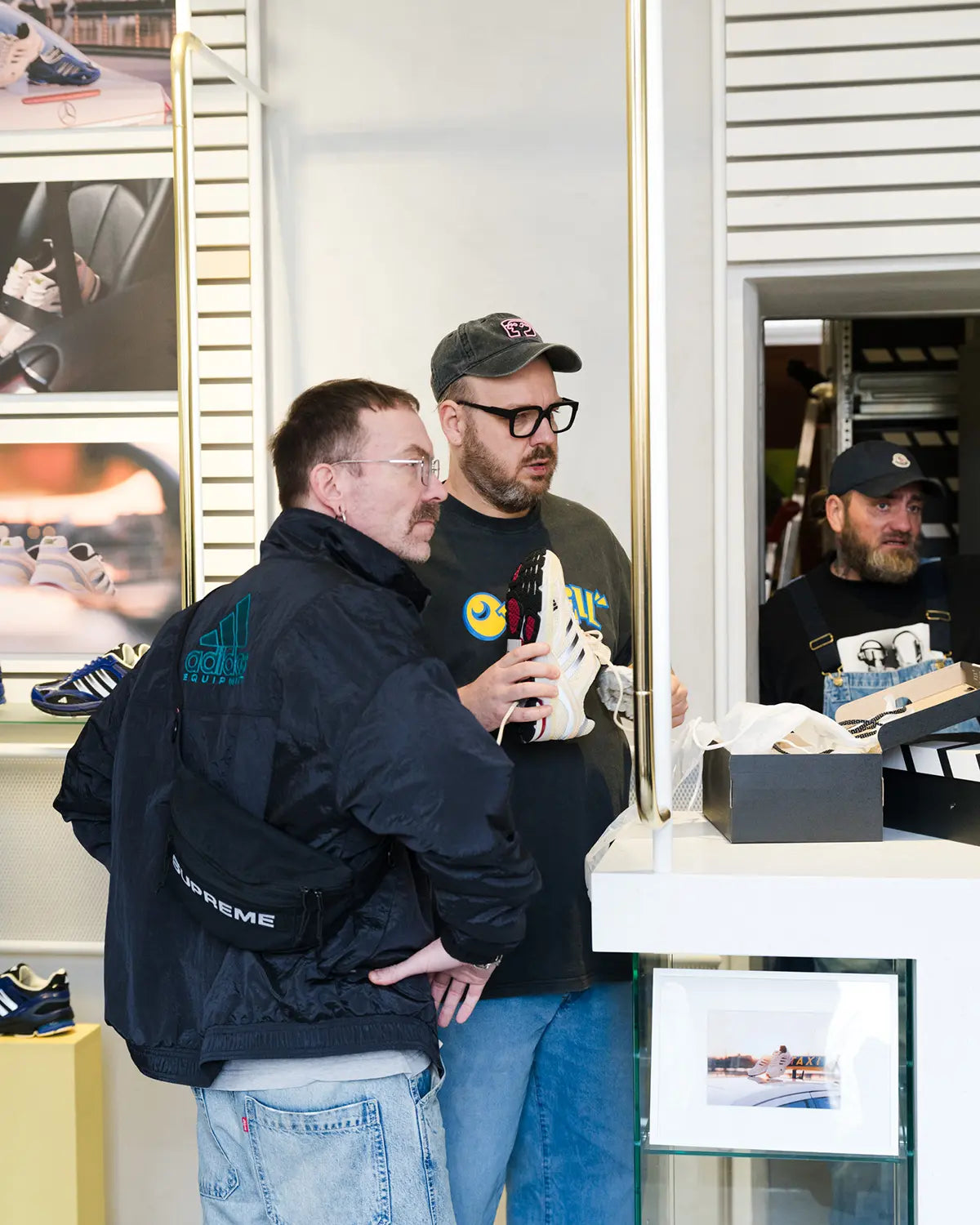 Large-scale prints from the campaign shoot defined the visual atmosphere of the space, perfectly capturing the aesthetic of the Spiritain 2000 Overkill. A special highlight was the display case, featuring the Overkill x adidas Equipment Racing 93 Taxi, complete with its special box and accompanying goodies — the very design foundation the Spiritain 2000 Overkill is built upon.